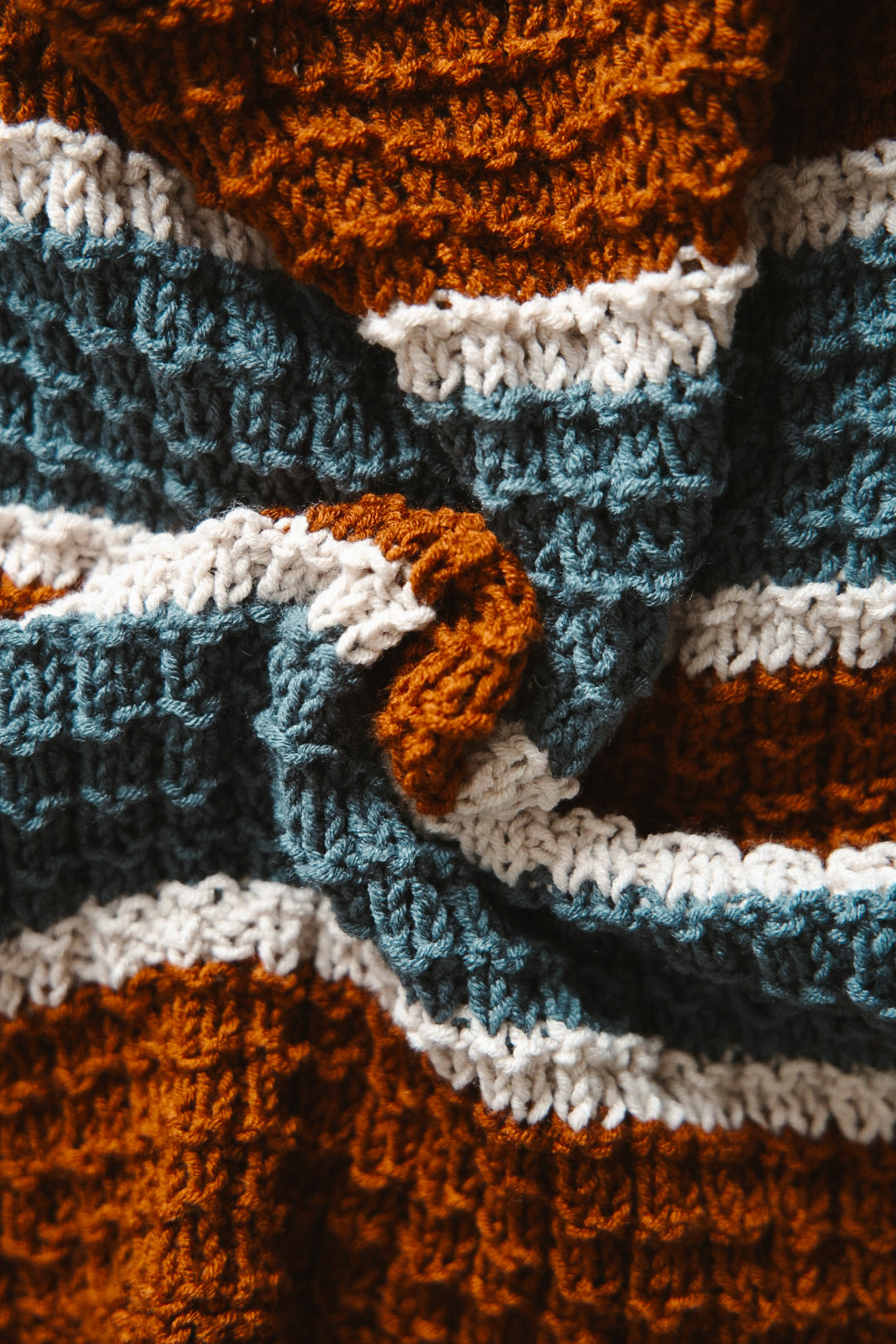 El cuerpo se teje cambiando de color cada ciertas filas, y con una combinación de puntos derechos y revés.